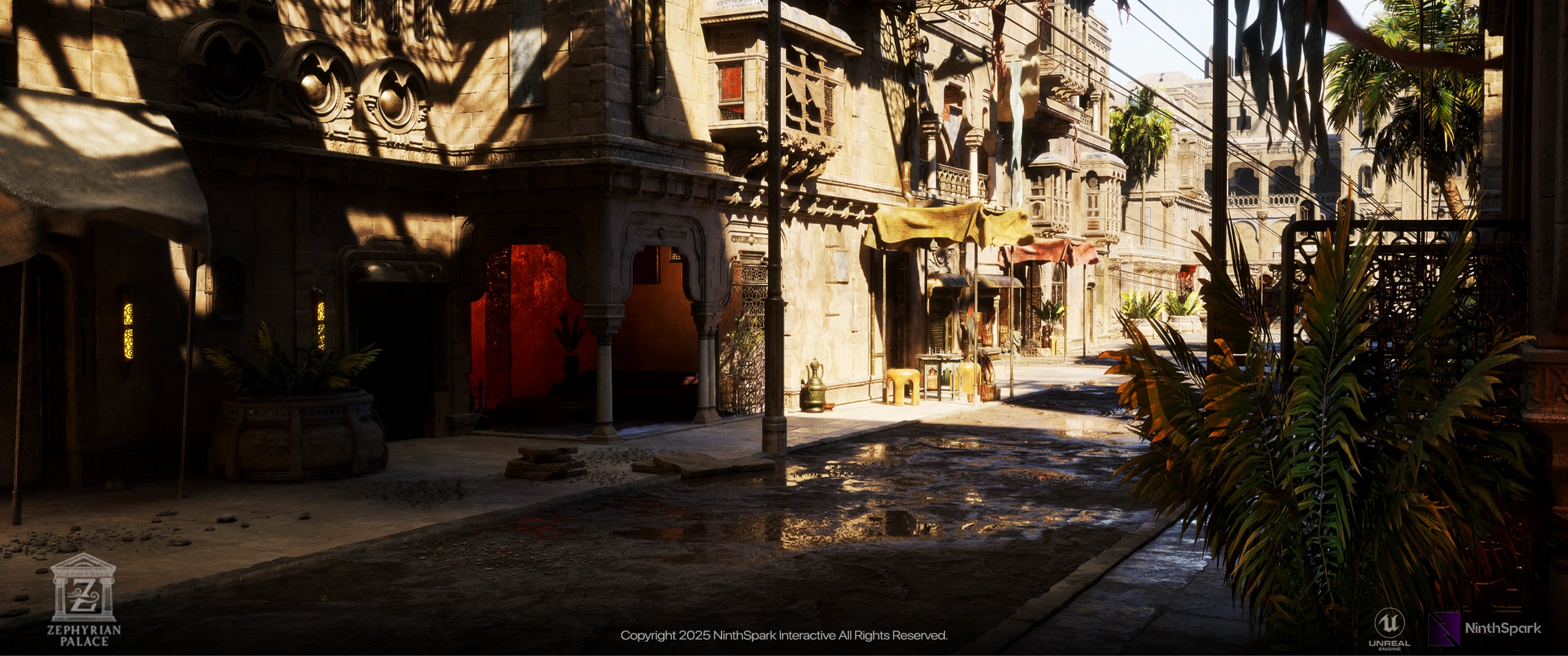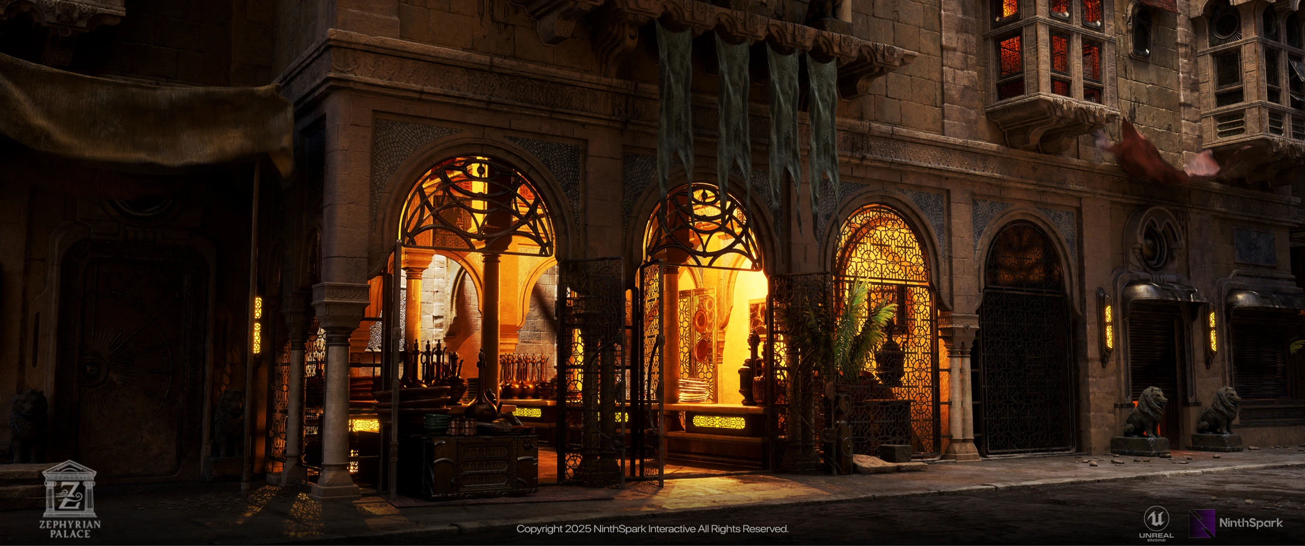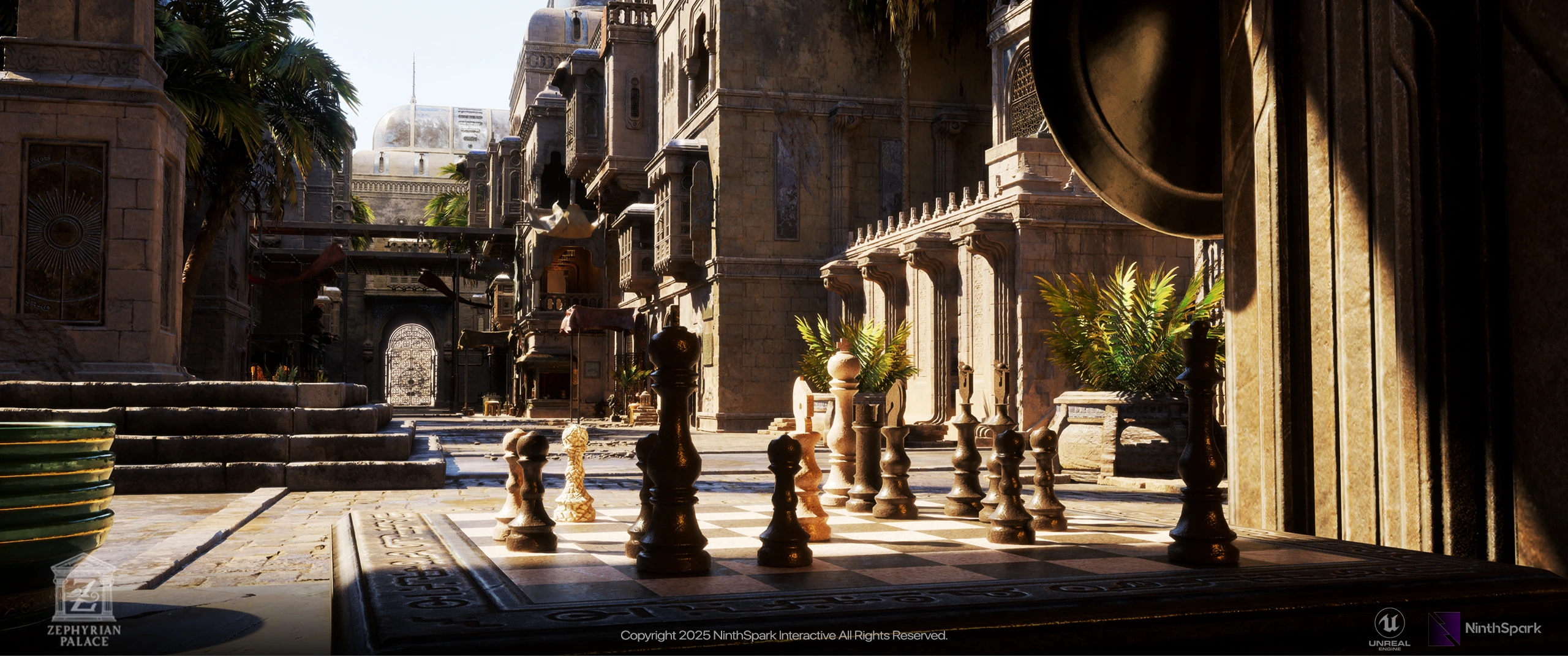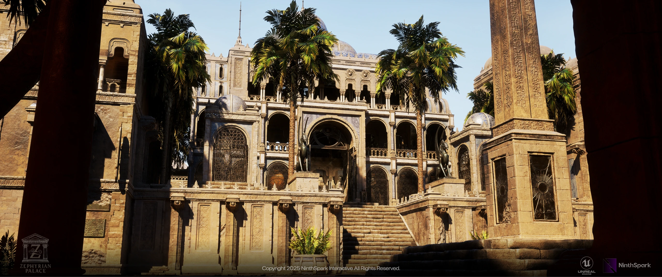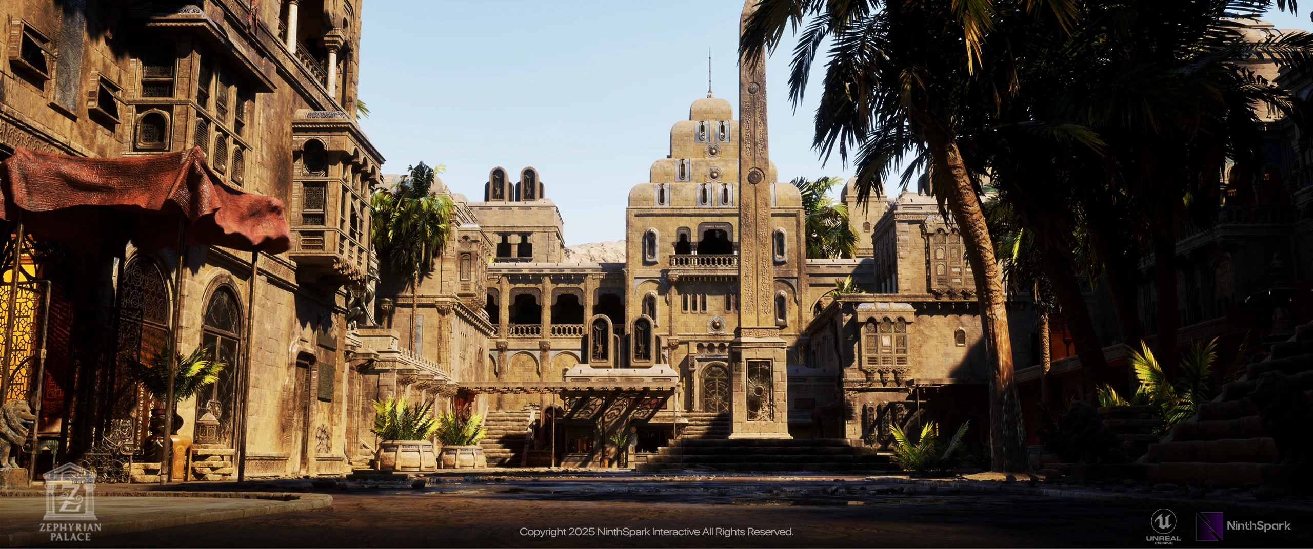 Zephyrian Palace is a Ninth Spark environment showcase exploring sunlit grandeur, ornate stonework, and layered spatial storytelling. Designed as a cinematic courtyard sequence, the piece frames a vaulted entryway, lattice-carved arcades, domed roofs, and palm-lined terraces, all tuned for clean read and silhouette. Material passes emphasize warm sandstone, aged patina, and filigree metalwork, while directional sunlight sculpts depth across the grand stair and colonnades. The goal: a living citadel that feels ritualistic, regal, and windswept ready for narrative beats, gameplay traversal, or a hero reveal.